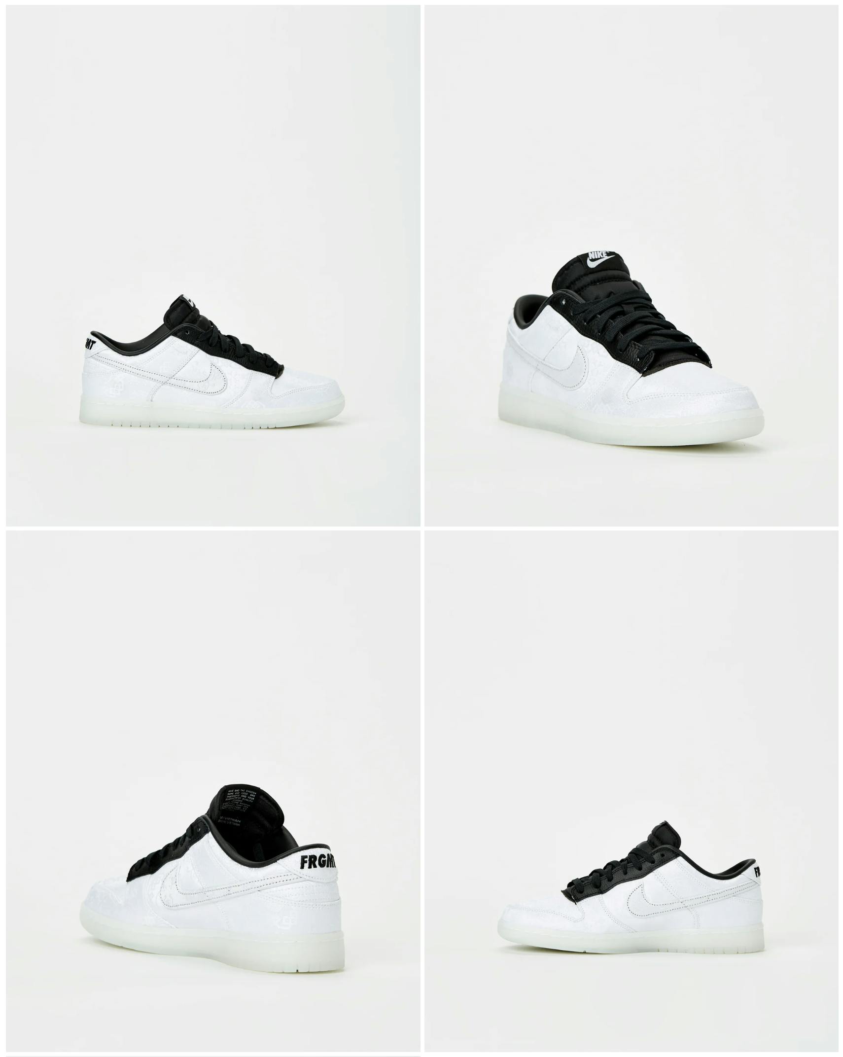 A sneaker designed in celebration of CLOT's 20th anniversary. Inspired by Hiroshi Fujiwara's favorite CLOT shoe of all time, the Nike Dunk Low x CLOT x Fragment Design features an all-white silk inspired upper patterned with CLOT's iconic Silk Royale, set on a cream-white opaque sole. The tongue, lace stay and heel tab are rendered in black, resulting in the striking panda-inspired colorway. The insole features the CLOT20 logo, marking this a special release.