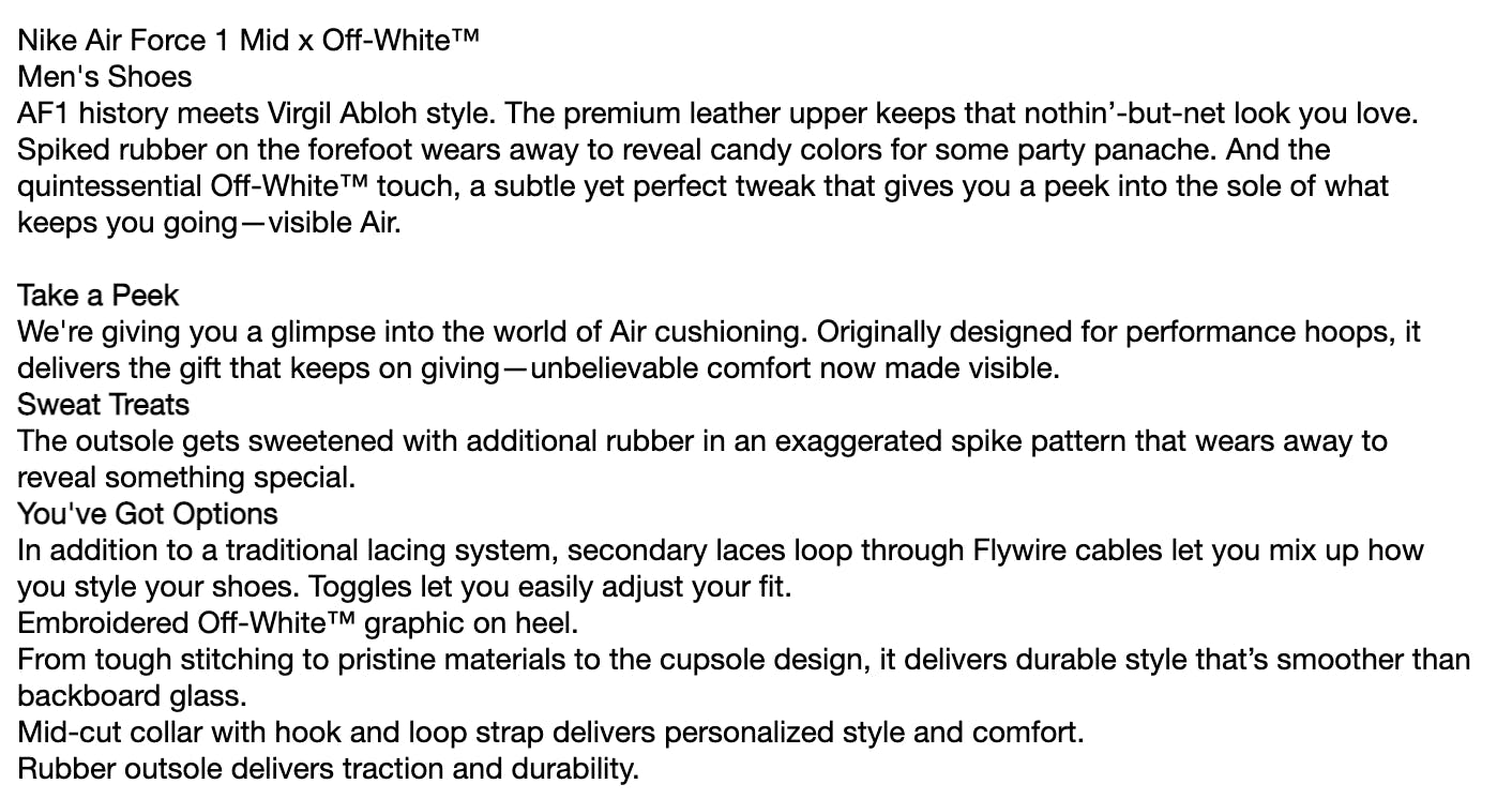 AF1 history meets Virgil Abloh style. The premium leather upper keeps that nothin’-but-net look you love. Spiked rubber on the forefoot wears away to reveal candy colors for some party panache. And the quintessential Off-White™ touch, a subtle yet perfect tweak that gives you a peek into the sole of what keeps you going—visible Air.